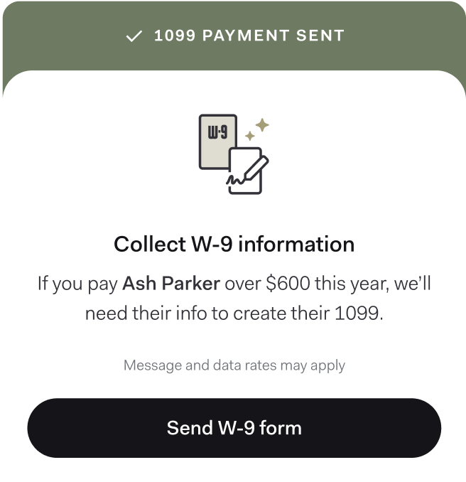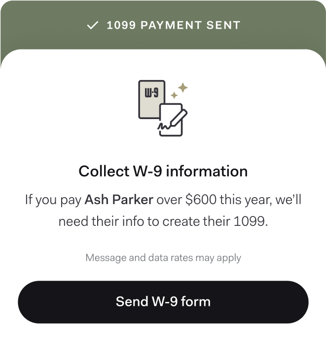 Found makes hiring 1099 contractors seamless from start to finish. Easily collect W-9 forms, pay your people quickly, and stay on top of taxes at the end of the year.