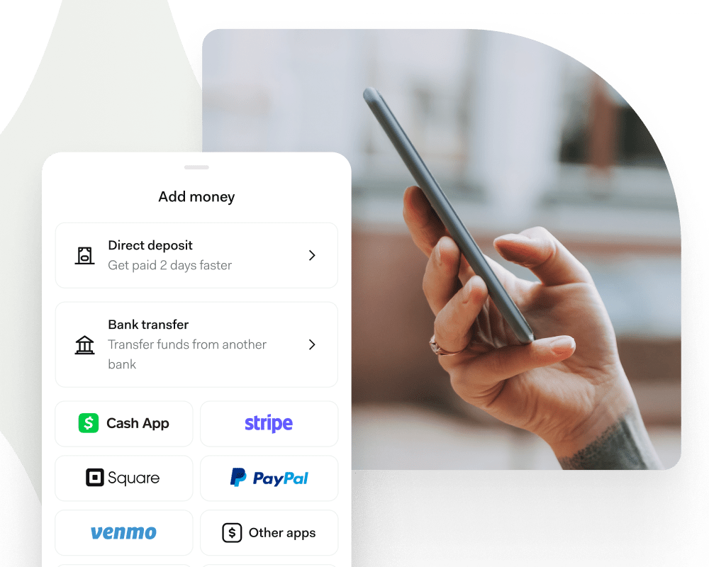 Add money using a payment app, make a cash deposit, or set up direct deposit and get paid up to 2 days early.**