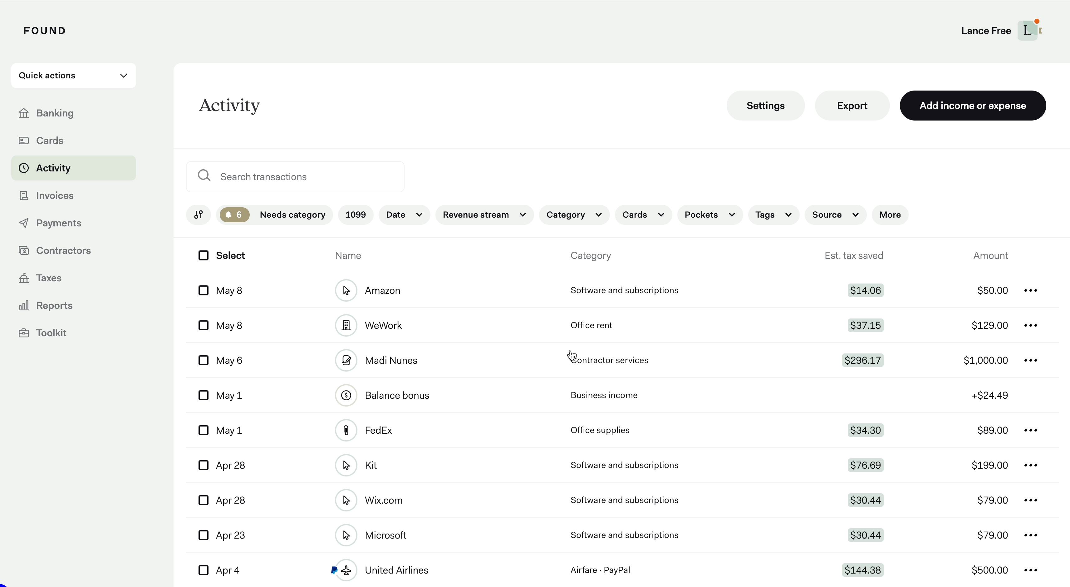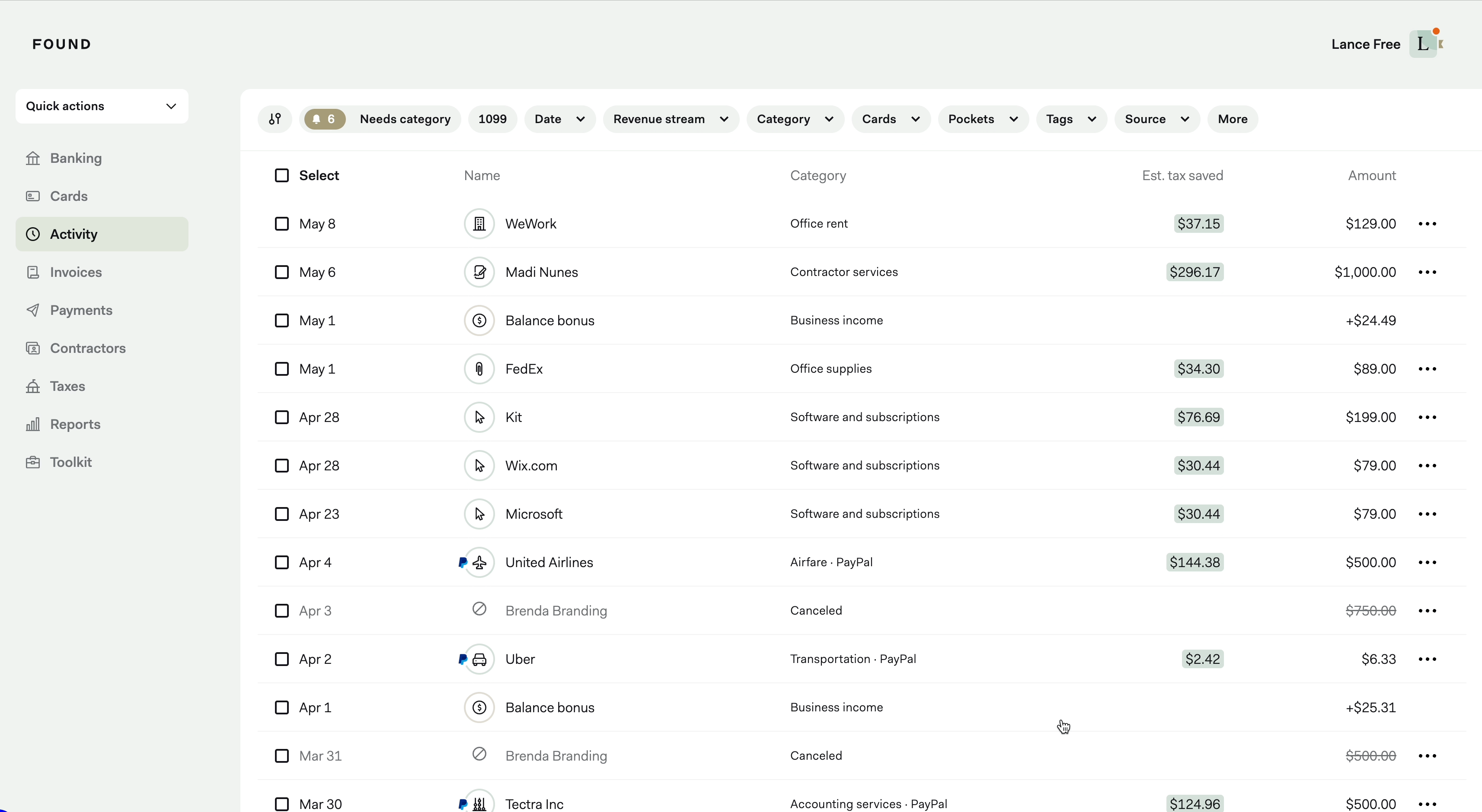 Solution: As you spend on your Found debit card, pay contractors, or import expenses from other accounts, we help you categorize those expenses, add receipts, and create rules to automate this work moving forward.