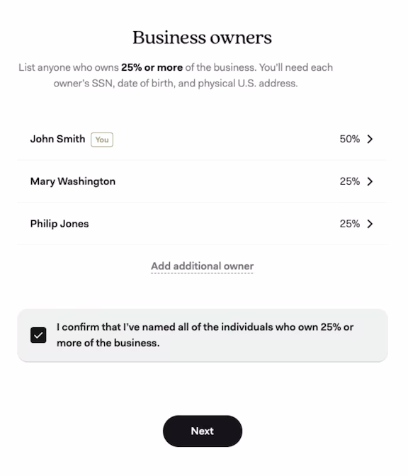 Make sure that you do not enter 100% here, since other people need to have at least some ownership in order to qualify as a multi-owner business. You will be able to add additional owners with their percentage of ownership on a later screen in onboarding.