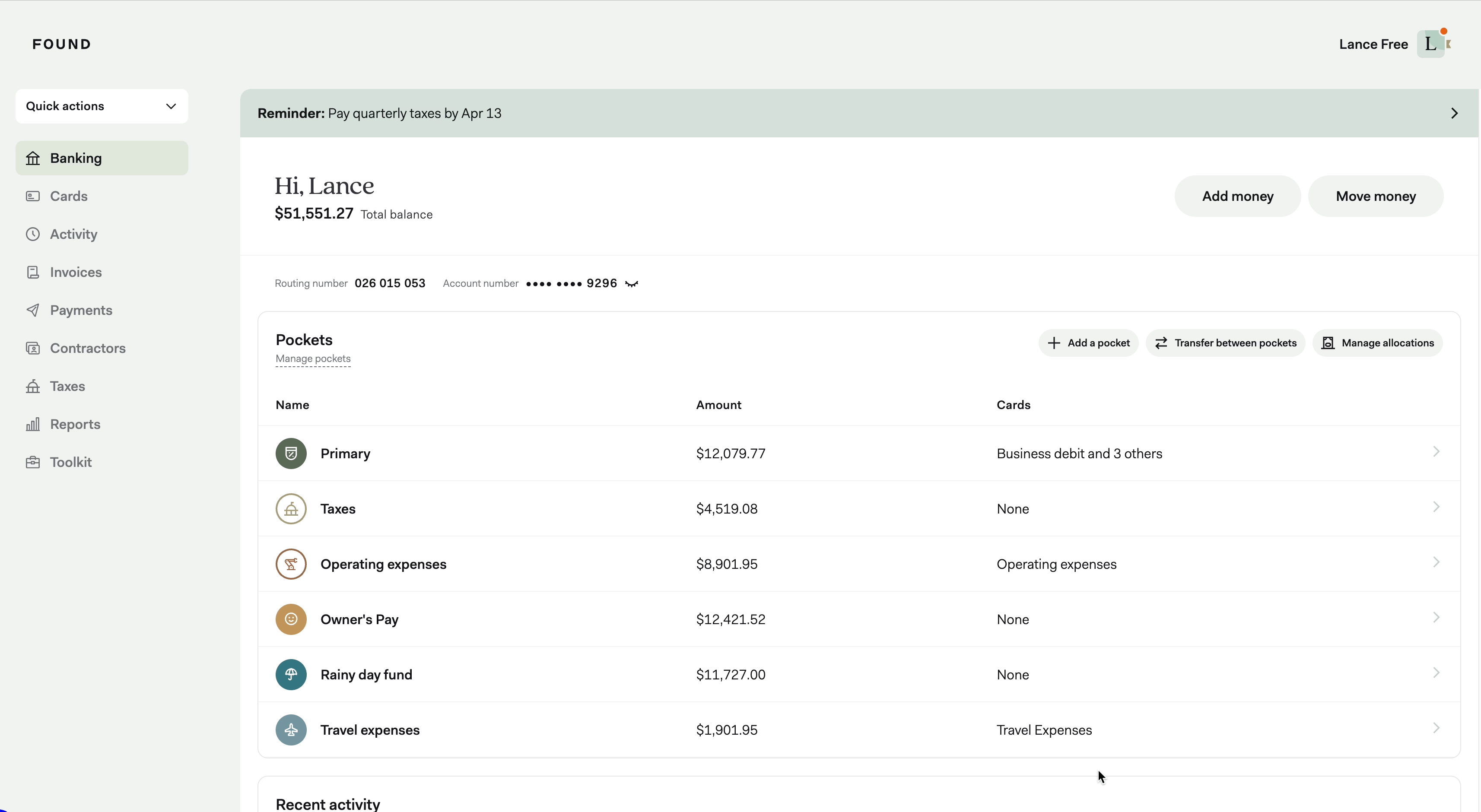In the Banking section, use your Taxes pocket to automatically set aside money for taxes every time you earn income into your Found account.