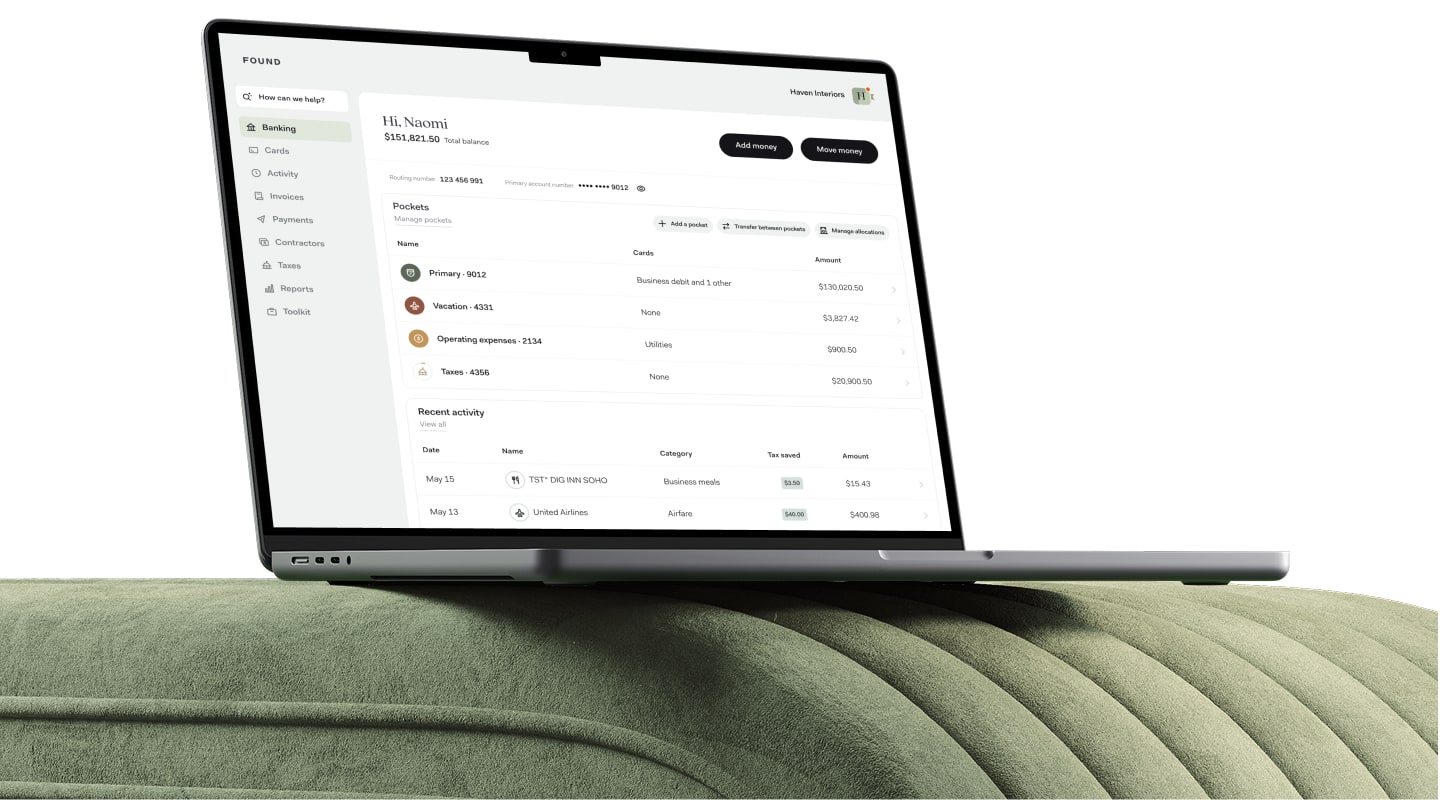 ⁴Optional subscriptions to Found Plus for $19.99/month or $149.99/year or Found Pro for $80/month or $720/year. There are no monthly account maintenance fees, but other fees such as transactional fees for wires, instant transfers, and ATM apply. Read Found Fee Schedule.