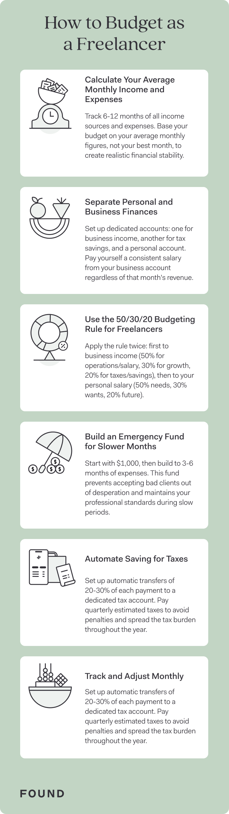 Found was created specifically for freelancers, offering an all-in-one business bank account that simplifies taxes, invoicing, and bookkeeping. Key features include automatic tax withholding, real-time tax estimates, and built-in expense tracking to maximize deductions. With no hidden fees or maintenance fees⁴, monthly minimums, or credit checks, Found makes it easy to separate business and personal finances—a critical first step in our budgeting system.