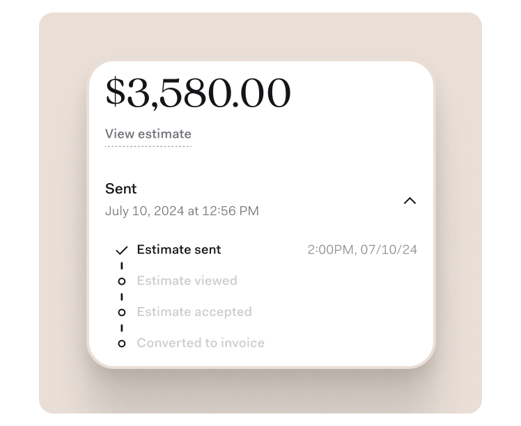 Now, with a few taps, it’s easy to create a custom estimate for a client. You can add items, optional notes, and attachments—all the same information as an invoice, without the payment link. You can send it immediately or schedule to send it at a later date.